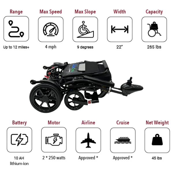 - • Airline-Approved Lithium Battery: The 10AH battery meets airline and cruise standards, making this a wheelchair for cruise and airline travel.