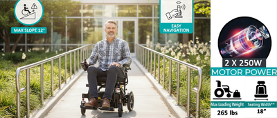 • All-Terrain Ready: With 7" front wheels and 11" rear wheels, this compact electric wheelchair handles sidewalks, ramps, and gentle slopes with ease.