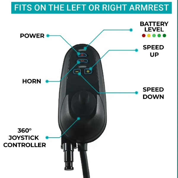 - • 360° Joystick Control: Navigate confidently through tight spaces with a wheelchair with joystick control. Includes a remote for caregivers, adding flexibility and safety.