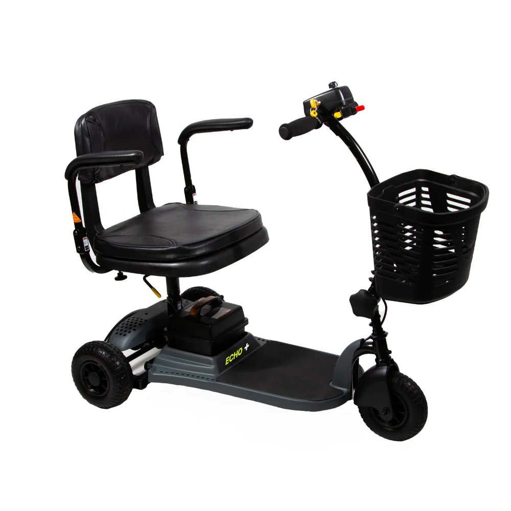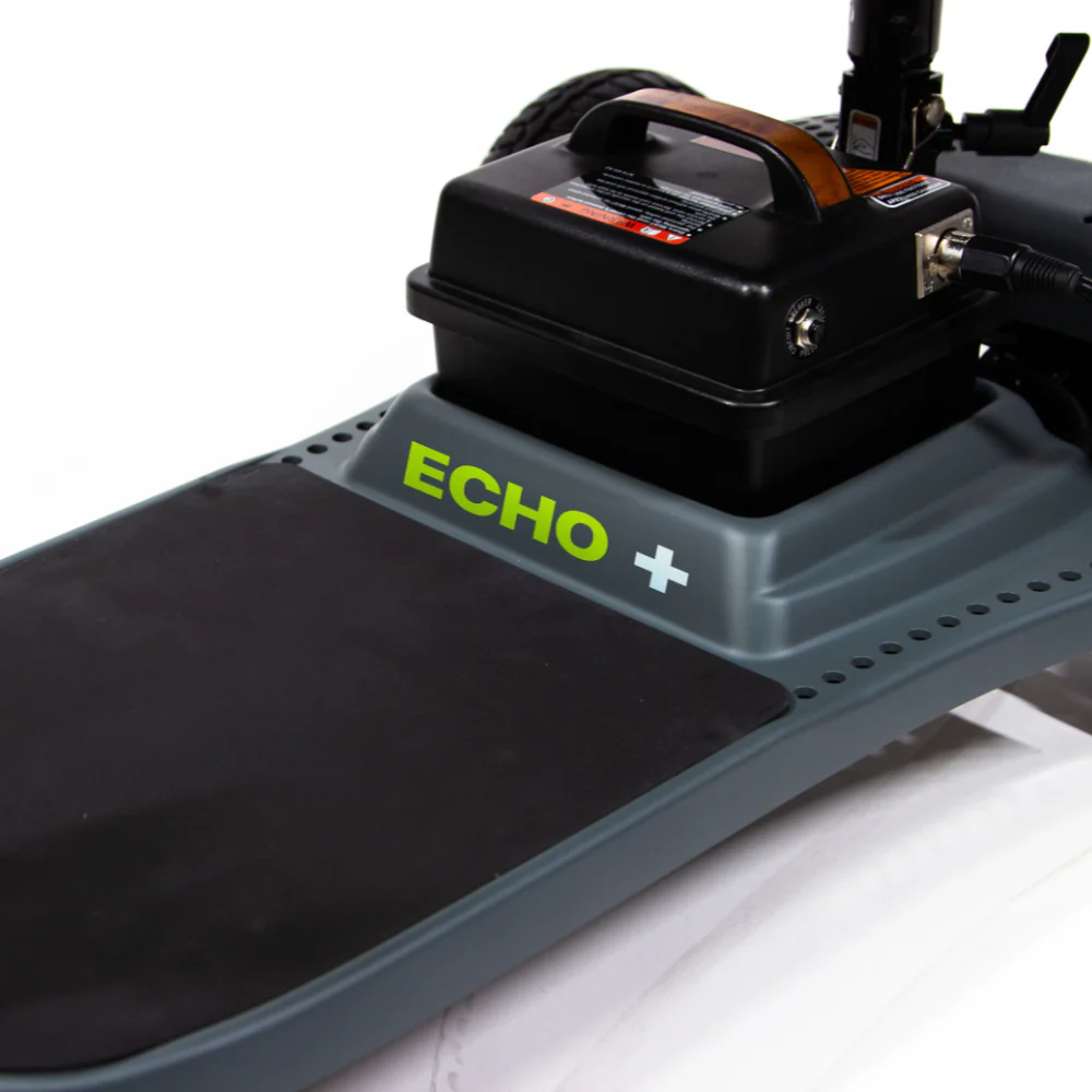 three main parts for portability and storage; with the heaviest part weighing just 40 lb. It has a swivel seat to easily enter and exit the scooter and a curved tiller for more leg room. The Echo + also comes standard with a quick connect battery pack, solid tires, and a new larger basket to store personal items.