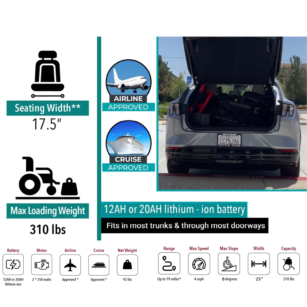 Approved for airline and cruise travel when equipped with the 12AH battery.
