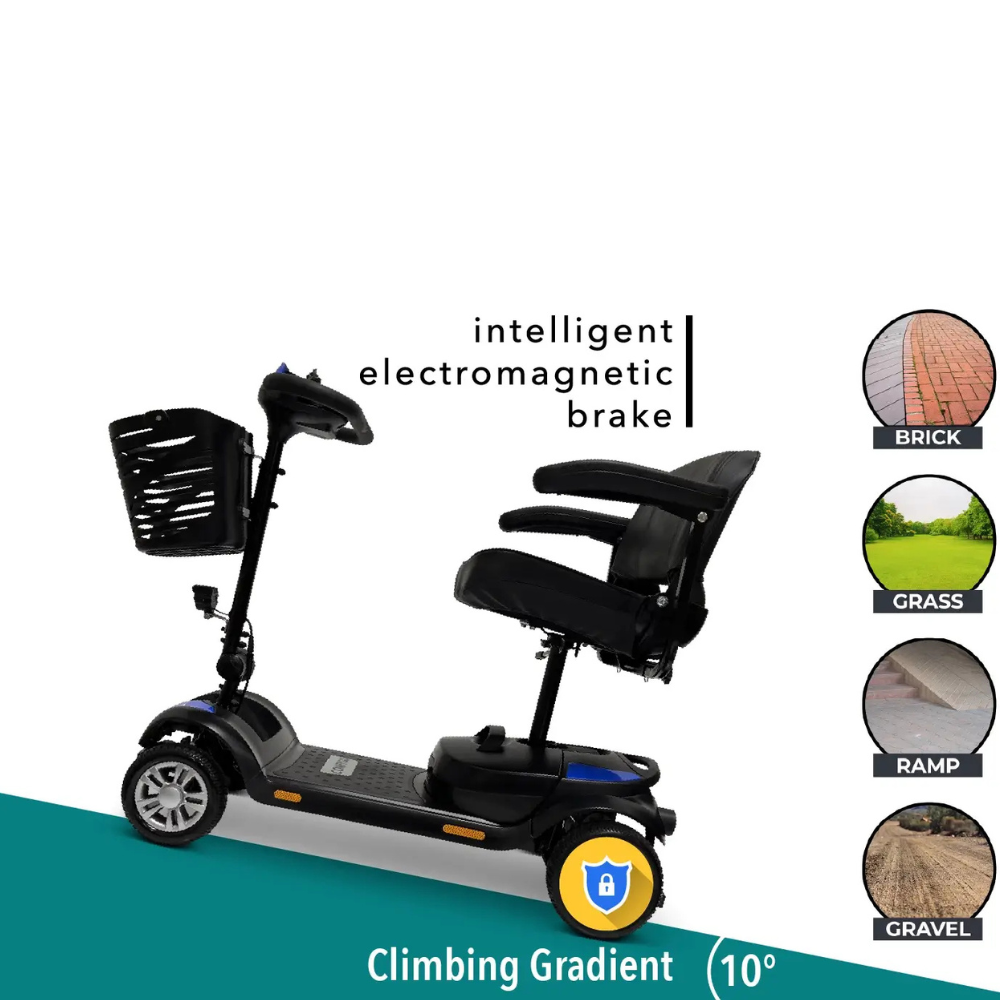 It's your portable scooter that redefines convenience and performance.Experience powerful all-terrain capabilities with the Z-4's 250W silent motor, designed to tackle inclines up to 12 degrees while ensuring a smooth ride. The intuitive controls cater to both left and right-handed users, and the intelligent braking system guarantees safety on every journey.
